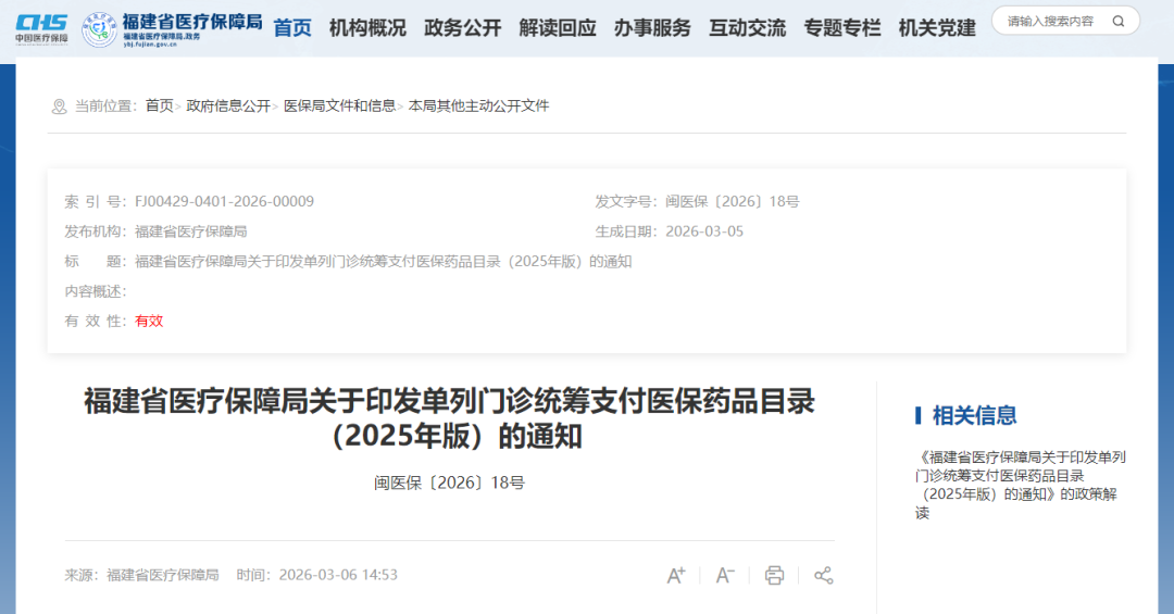 近日,福建省医疗保障局发布《关于印发单列门诊统筹支付医保药品目录(2025年版)的通知》,参保人员在定点医疗机构使用“单列支付药品目录”内的药品,无需住院在门诊也能按规定享受到医保报销待遇。新版目录自2026年3月10日起正式执行。